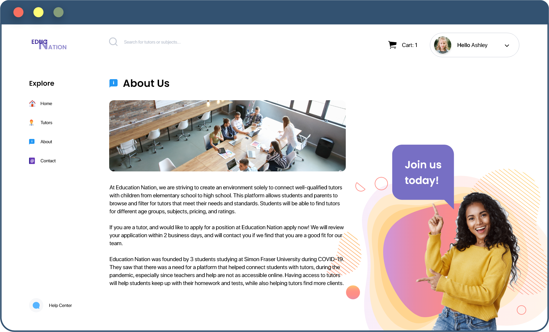 Education Nation allows students ranging from kindergarten through grade 12 to have access and connect with tutors or mentors for a specified subject through an online platform. The web application is the middle point that connects students with tutors.